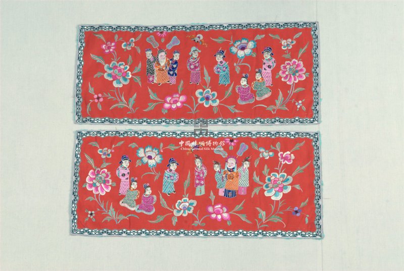形状内容描述 该套绣品共两件,以大红色八枚缎织物为底,每片上各绣有八个人物,一片为一老夫人,另一片为一老员外,分别由两人扶定,接受其余五人或跪或立的祝贺,此外,两片枕面皆在空白处绣以牡丹、蝙蝠等寓意吉祥的图案,烘托了祝寿气氛。枕面以彩色丝线刺绣,人物部分还使用了白色的包梗线勾边,使人物形象更为立体突出。