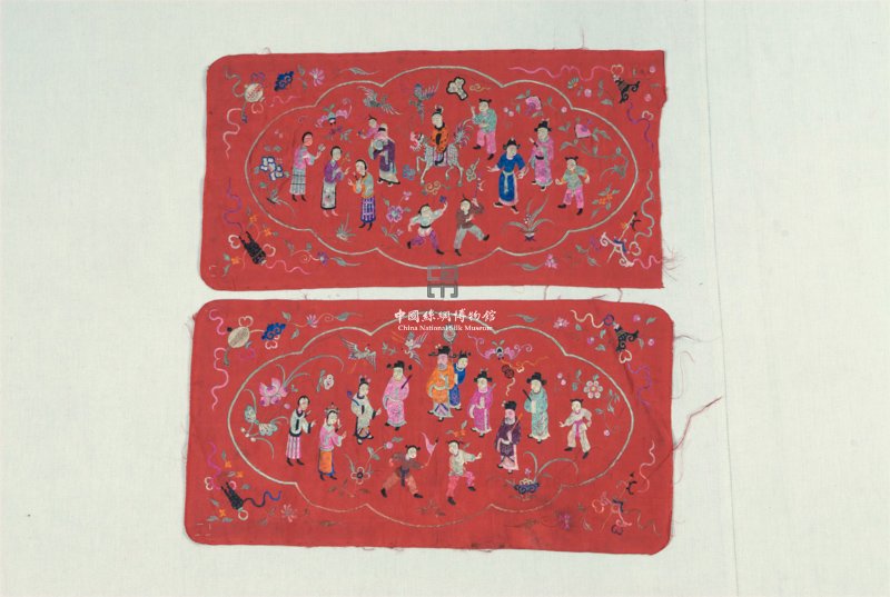 形状内容描述 该套绣品共两件,以大红色八枚缎织物为底,其主体图案处于一瓣窠中,周边饰以杂宝纹样,每个瓣窠中均绣有人物若干,或为童子,或为老翁,或为青年男子,或为少妇,还有一人骑着麒麟;其中几个少妇身穿具有典型20年代风格的倒大袖袄。