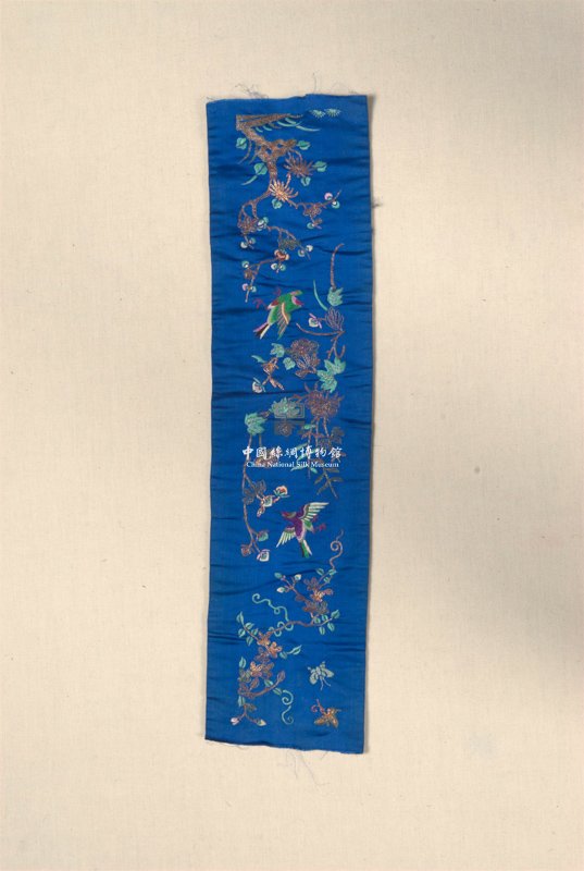 形状内容描述 该件绣品保存情况良好,以蓝色八枚素缎织物作绣地,除以彩色丝线刺绣外,还使用了钉金绣的技法。古时以杏月喻殿试之期,绣品以燕子翩飞于杏林为其主题图案,比喻科举高中之意。