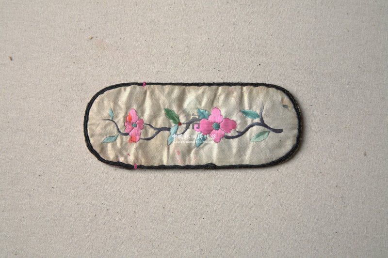形状内容描述:此为一眼镜套,绿色缎为地。其上用玫红、粉红、褐色等彩色丝线绣出梅花纹样。针法以平针为主。镜套周围用深褐色丝线锁边。绣品配色柔和,大方典雅。