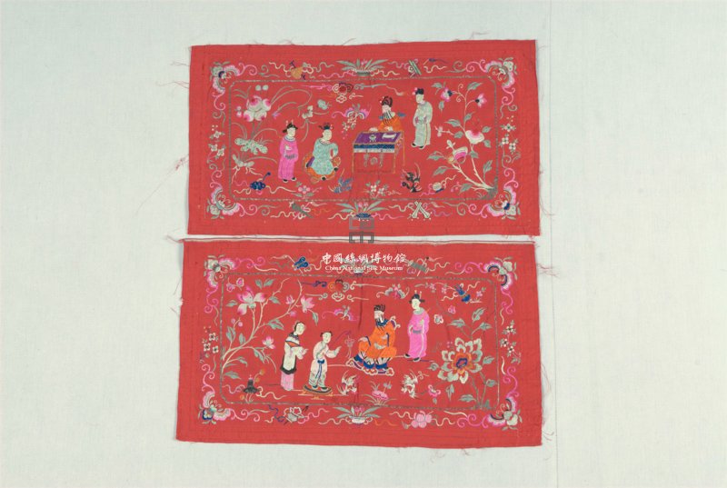 形状内容描述 该套绣品共两件,以大红色八枚缎织物为底,其上钉缝捻金线以圈出主体图案区,四周则饰以以蝴蝶、花卉、暗八仙等构成的适合纹样。每片的主体图案除四个人物外,还间以花、鸟、蝴蝶、寿桃、杂宝等,以彩色丝线绣成,使用了打籽绣、钉金绣等刺绣技法。