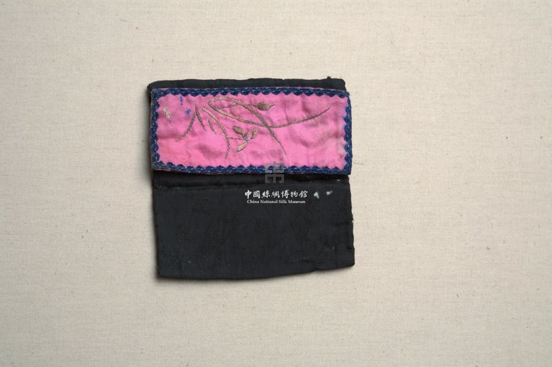 形状内容描述:该钱袋呈长方形,袋身以黑色几何纹暗花绸织物制成,其基础组织为平纹地上起3/1左斜纹花,袋盖则采用粉红色素缎织物,其上以彩色丝线绣出兰花纹样。