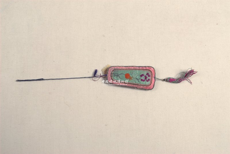 形状内容描述 该绣品为一方形香囊。在绿白色缎地上绣一枝呈S状的桃花。香囊周围镶蓝、红等边饰。下垂红绿相间的缨络。