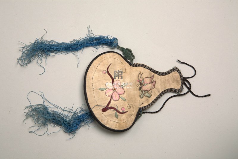 形状内容描述:该绣品为一葫芦形荷包。在黄褐色缎地上用彩线绣出一枝含苞欲放的桃花和闻香而来的蝴蝶。针法包括平针、钉金绣等。荷包周围镶深褐色绦带,两边垂下丝质缨络。