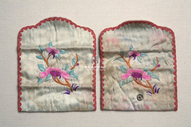 形状内容描述:该钱袋共有一对,其形制、面料及刺绣图案均相同。一边袋身以印花棉布制成,另一边袋身连同袋盖则采用白色素缎织物,其上以彩色丝线绣出花卉纹样,并缝有揿钮。