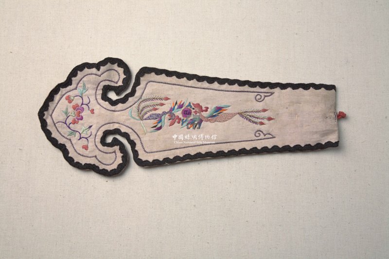 形状内容描述:该饰件以白绸为地,一头做成云头状。上面彩绣凤凰花卉。主要采用套针、钉金绣。周围以深褐色齿轮状黑色素缎镶边。