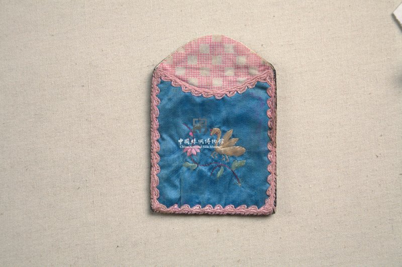 形状内容描述:该绣品为一名片袋。在蓝色的缎地上用彩线刺绣。针法以平针为主。纹样为蜂采花蜜的场景。整个绣品小巧精致,充满中国风情。