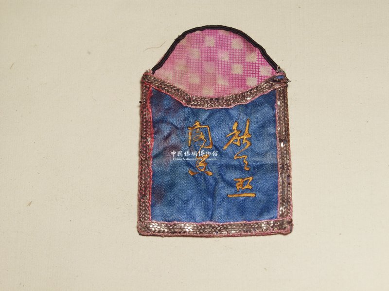 形状内容描述:此件绣品原用作装名片之用,以蓝色素缎织物为绣地,四周镶以花边,其上用黄色丝线绣出"秋月照阁香"五字。