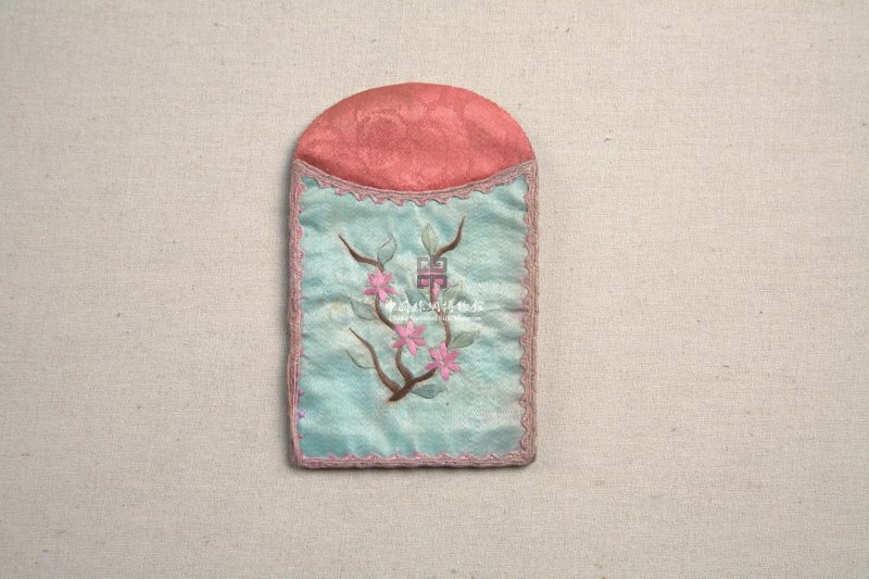 形状内容描述:该绣品为一名片袋。在浅绿色的缎地上用彩线刺绣。针法以平针为主。纹样为一枝婀娜多姿的梅花。片袋周围镶粉红花边。整个绣品小巧精致,充满中国意味。