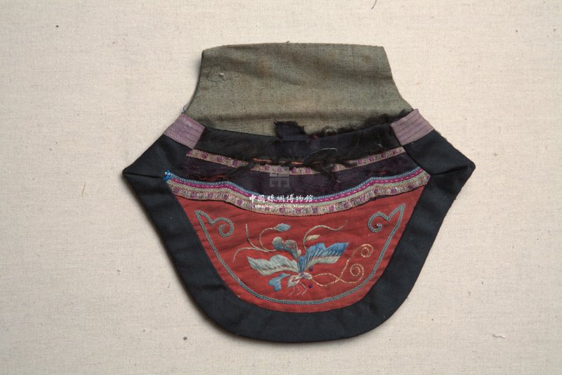 该钱袋的黑缎镶边已破损,以红色暗花绸为主体图案区,其上用彩色丝线及捻金线以绣出蝴蝶及花卉纹样,另还镶有两道花边。