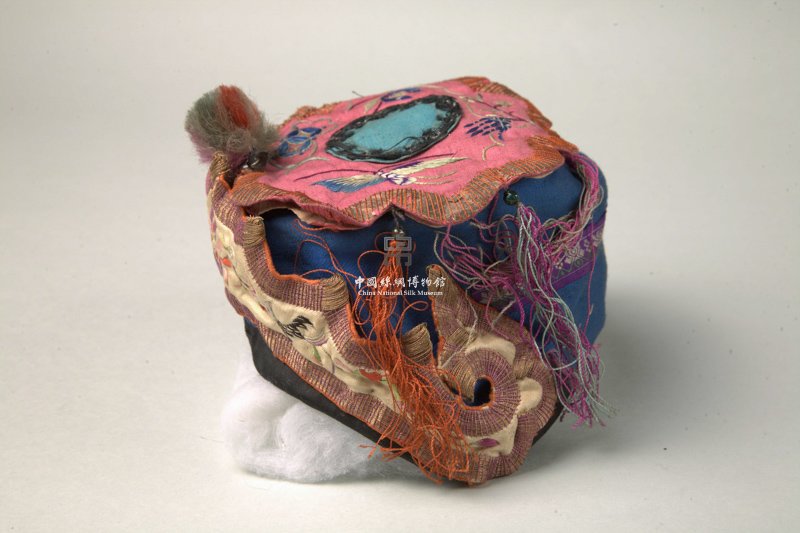形状内容描述 该童帽主要采用贴绣方法制作。面料采用黄、红等色的素缎,其上彩绣花鸟纹样。帽身左右两边垂有红绿色丝质流苏。因运用贴绣法,因而具有较强的立体感。