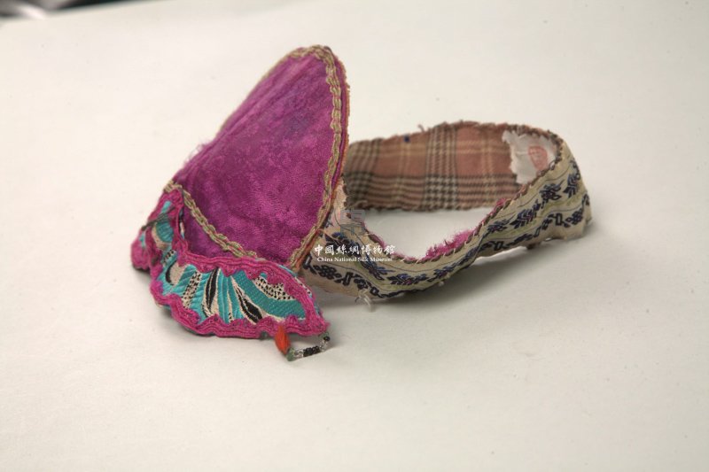 形状内容描述 该童冠饰,正面为一块桃红色暗花绸,帽沿为白色缎地上几何纹花的绦带。