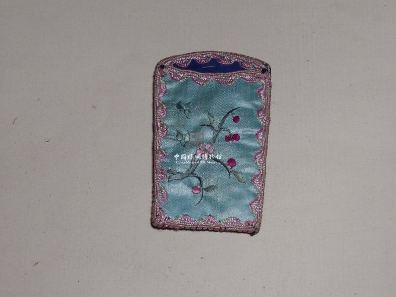 形状内容描述:该绣品为一名片袋。在淡绿色的缎地上用彩线刺绣。针法以平针为主。纹样为一枝桃花。整个绣品小巧精致,充满中国风情。