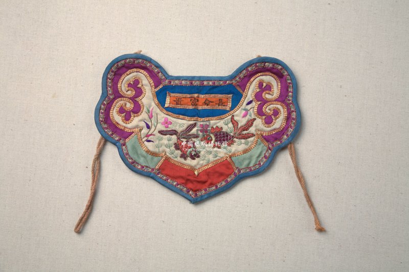 形状内容描述 该口围片用红、绿、黄等多块彩色绸料制成长命锁状。中央的白色绸地上采用网绣、钉金绣、套针等多种针法绣出两条嬉戏于水草中的金鱼。最顶上一块蓝色绸地上则绣"长命富贵"四字。表达了父母对孩子美好的期望。口围片周围用蓝色素缎缘边。整件绣品具有强烈的民间风味。