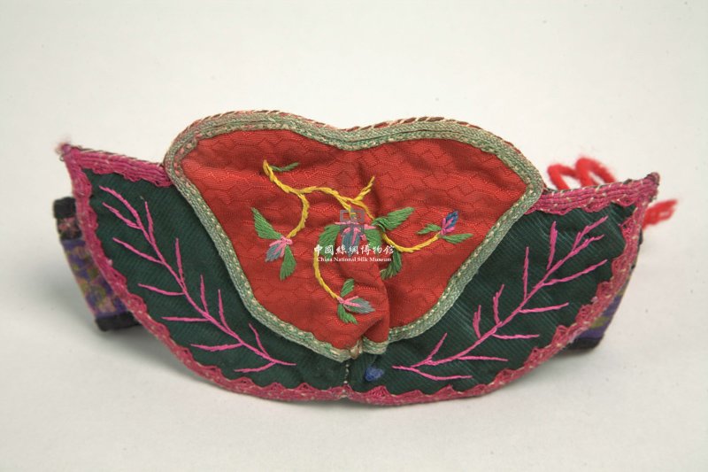形状内容描述 该童冠饰采用红黑两色绸地为主体面料,制成双叶托红花状。绸地上彩绣花卉纹样。主要针法为套针、缠针等。绸地周围镶有红绿色小绦带作为花边。
