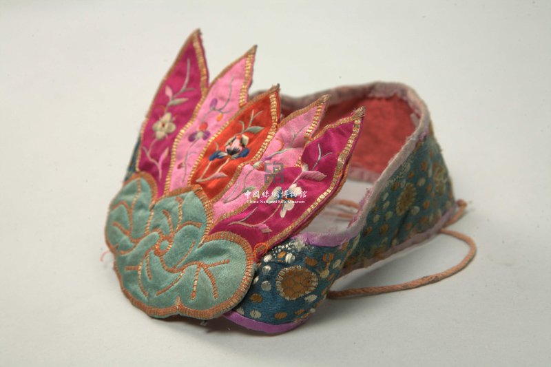 形状内容描述 该绣品为一儿童冠饰。冠饰前方用红、绿等彩缎贴绣成荷花形。荷叶和花瓣用钉金绣缘边。绿色缎地的荷叶,其上的叶脉亦通过钉金绣形象表现。而大红、玫红及粉红的花瓣,其上主要采用套针的针法绣出各色花卉。