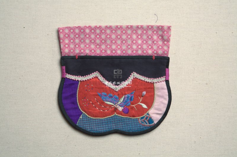 形状内容描述 该只钱袋保存完好,使用红色暗花绸为绣地,其上以彩色丝线绣出蝴蝶图案。