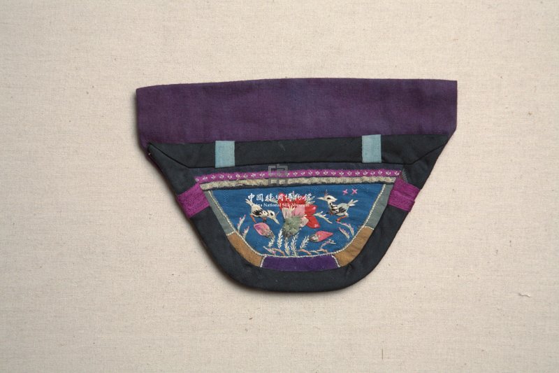 形状内容描述 该只钱袋外观呈碗形,使用蓝色暗花绸为绣地,四周以各色暗花绸装饰,黑色素缎镶边,其上用白、红、粉、绿等色绸以堆绫绣的方法绣出花鸟纹样,花形饱满立体。此外,花枝及鸟羽等处则以彩色丝线绣成。