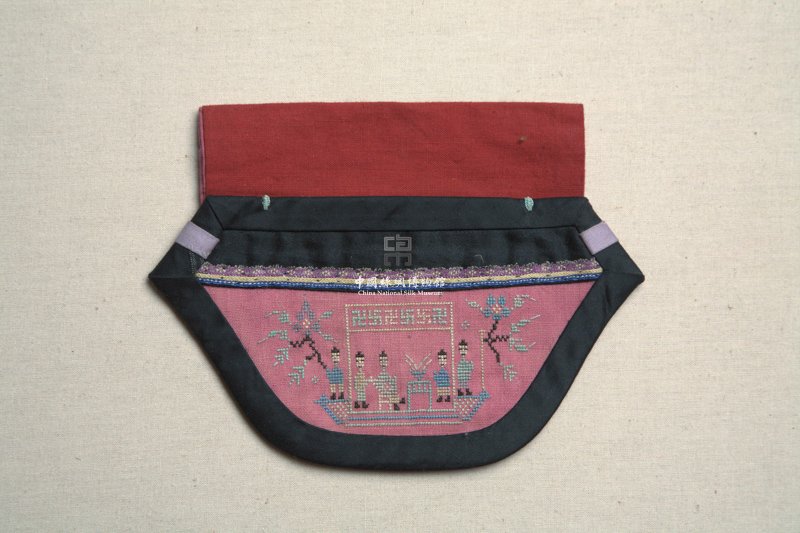 形状内容描述 该只钱袋保存较好,外观呈碗形,使用粉红色平纹素织物为绣地,其上以戳纱绣的方法用彩色丝线绣出人物花卉图案。