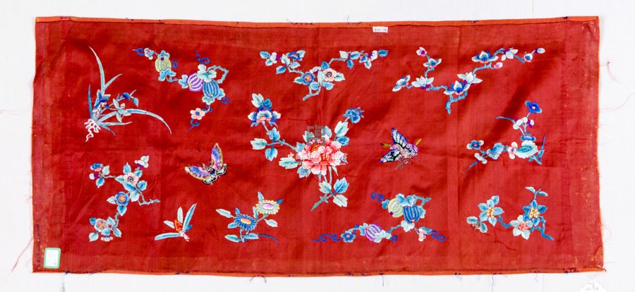 形状内容描述 该件绣片红色五枚素缎织物为绣底,现褪色较为严重,绣片使用了打籽、套针等刺绣技法,以玉兰花象征玉堂,牡丹花象征富贵,构成"玉堂富贵",寓意富裕而显贵。