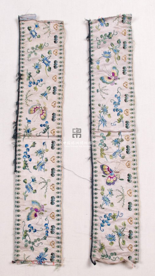 形状内容描述 该件共有两块,以藕色五枚素缎作地,其上用彩色丝线及捻金线以盘金、打籽、戗针等针法绣出蝴蝶、蝙蝠及花卉纹样。