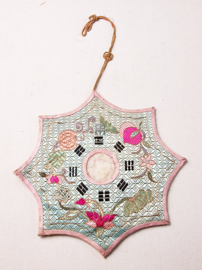 形状内容描述 此件绣品外观呈八角星形,原可能用作镜套,内衬棉花,一端还留有系绳。绣品以铺绒绣的针法成,纹样除八卦符号外,还有表示"多子、多福、多寿"的莲藕、佛手与寿桃纹样。