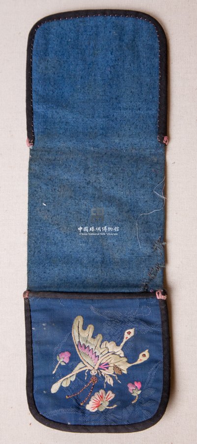 形状内容描述 该绣品为一褡裢,使用时挂在腰带之上,两端各成一个袋子,其上下袋子分别以粉红和深蓝色绸为地,并分别彩绣松鹤和花蝶纹样。所用针法以套针为主。