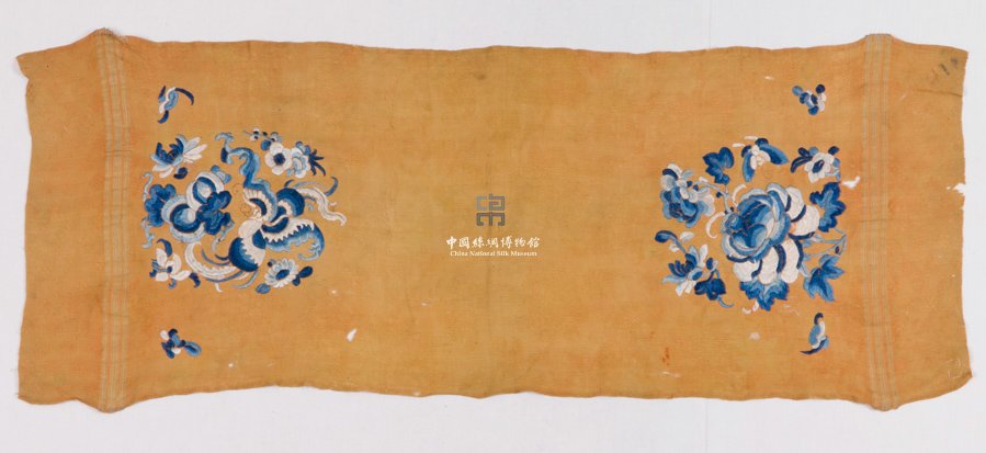形状内容描述 该件织物原当为红色,现褪色严重并有多处破洞。围巾以暗花绉绸制成,基础组织为平纹地上起3/1右斜纹花,图案分为三个区,两端分别长7.5cm的菱形花纹区,中间为长71cm的花蝶纹区,三区之间均以宽2.5cm的条形纹样区分隔。围巾两端各以各种深浅不同的蓝色丝线绣出花卉蝴蝶纹样,称为"三蓝绣"。