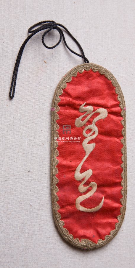 形状内容描述 此绣品为一眼镜套,红色缎为地。其上用红色、绿色、褐色等彩色丝线绣出折枝月季纹样。针法以平针为主。镜套周围用深褐色小绦带缘边。镜套顶上钉一根深褐色细长丝带。绣品配色柔和,大方典雅。