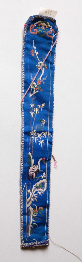 形状内容描述 该绣品为一扇套。主体面料为青色素缎。其上彩绣梅竹仙鹤纹样,所用针法以套针为主。扇套背面绣诗文一句。扇套周围镶深色小绦带花边。