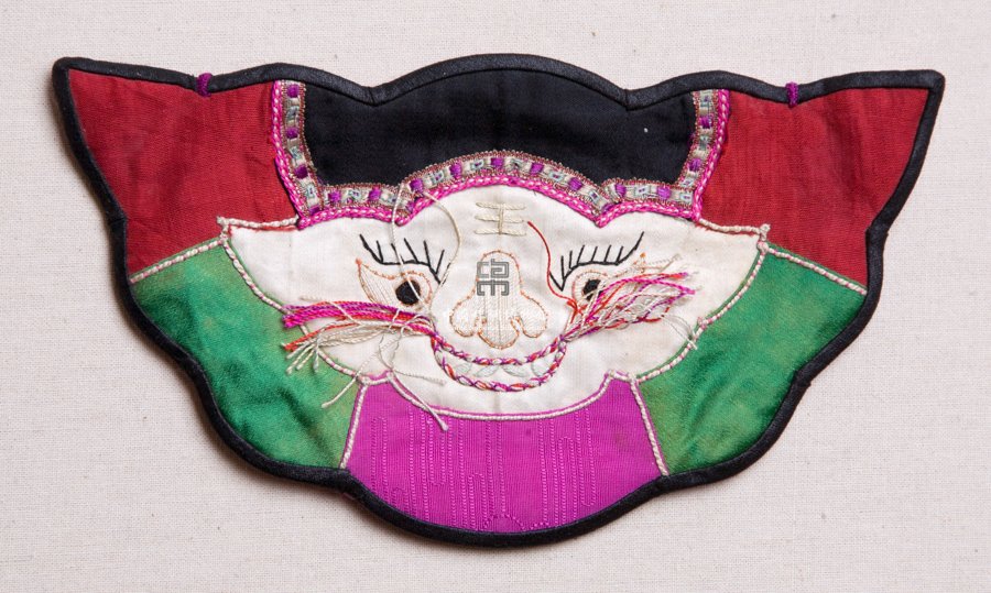 形状内容描述 该绣品为一钱袋,呈虎头形。主体面料采用五彩绸缎。其中央一块白色缎地上圈金绣一虎头。彩绸周围镶黑色素缎为边。