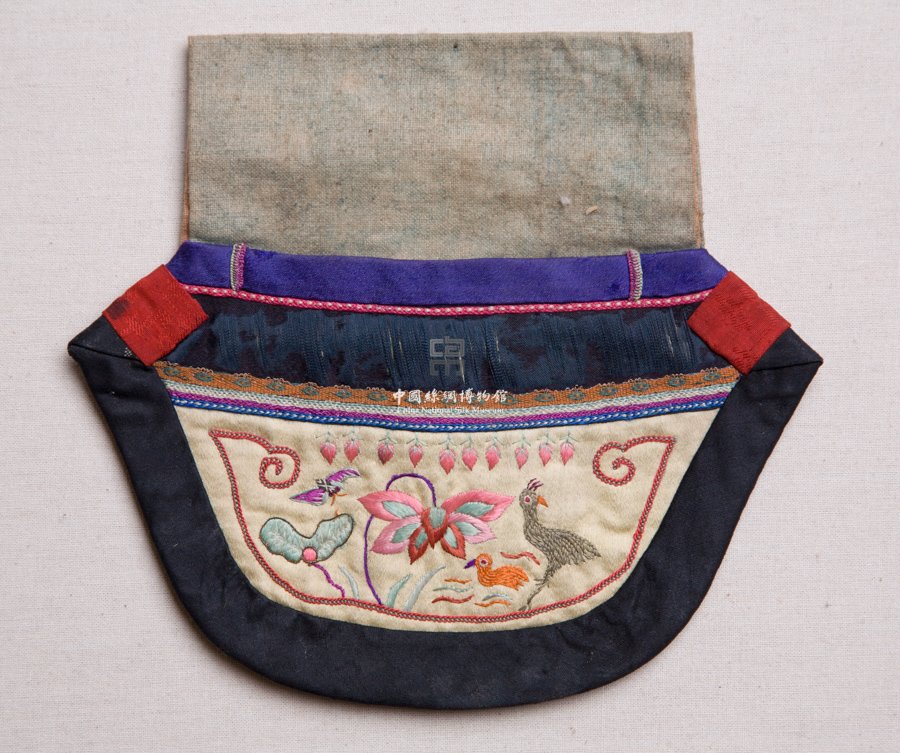 形状内容描述 该绣品为一钱袋,呈较特别的碗形。中央黄色缎地上彩绣荷花水鸭纹样。所用针法以套针为主,辅以拉锁绣等。