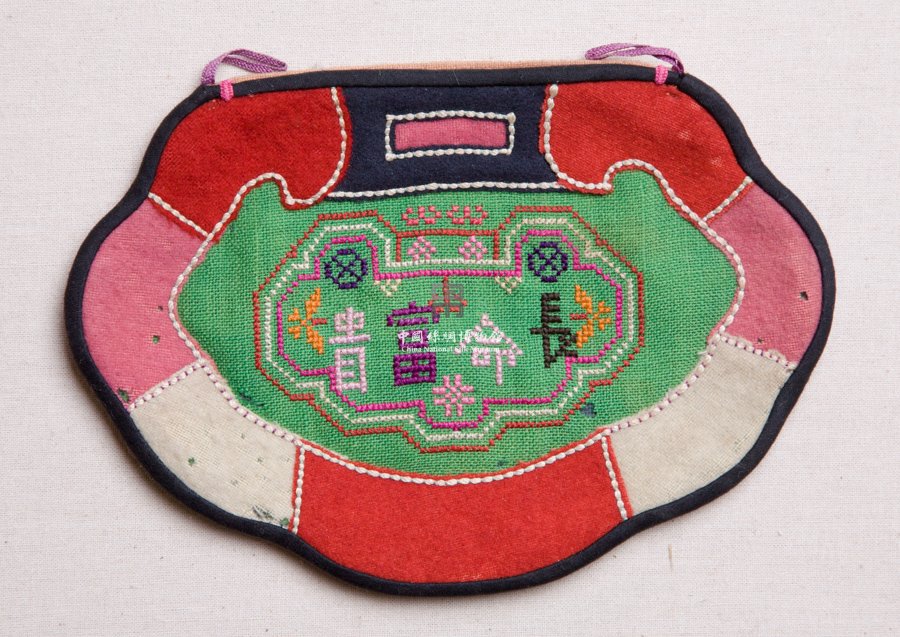 形状内容描述 该绣品为一钱袋,呈儿童长寿锁形。中央绿地戳纱绣"长命富贵"四字。周围镶红、黄、黑绸料。钱袋外围镶黑色素缎为边。