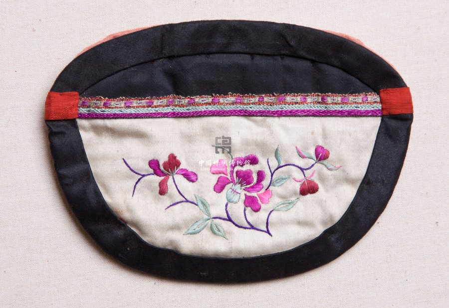 形状内容描述 该绣品为一钱袋。主体面料采用白色素缎,其上彩绣花卉纹样,所用针法以套针为主,辅以滚针等。白缎周围镶黑色素缎为边。