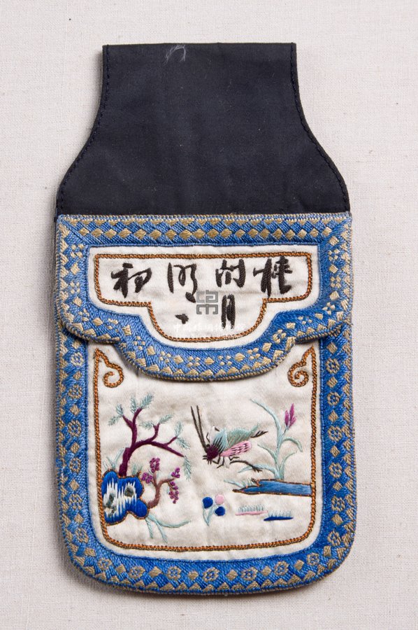 形状内容描述 该绣品为一钱袋,袋身呈方形。主体面料采用白色素缎,其上彩绣花草虫纹样。所用针法以套针为主,辅以直针、打籽等。钱袋盖用黑色丝线绣诗文一句。