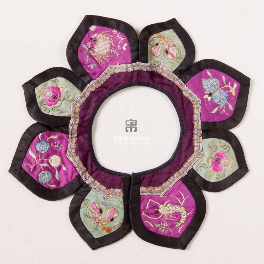 形状内容描述 该口围用玫红、秋香色等五彩缎制成八瓣花形。彩缎上圈金绣花卉虫蝶纹样,同时结合平绣等绣法。彩缎外围用黑色素缎镶边。