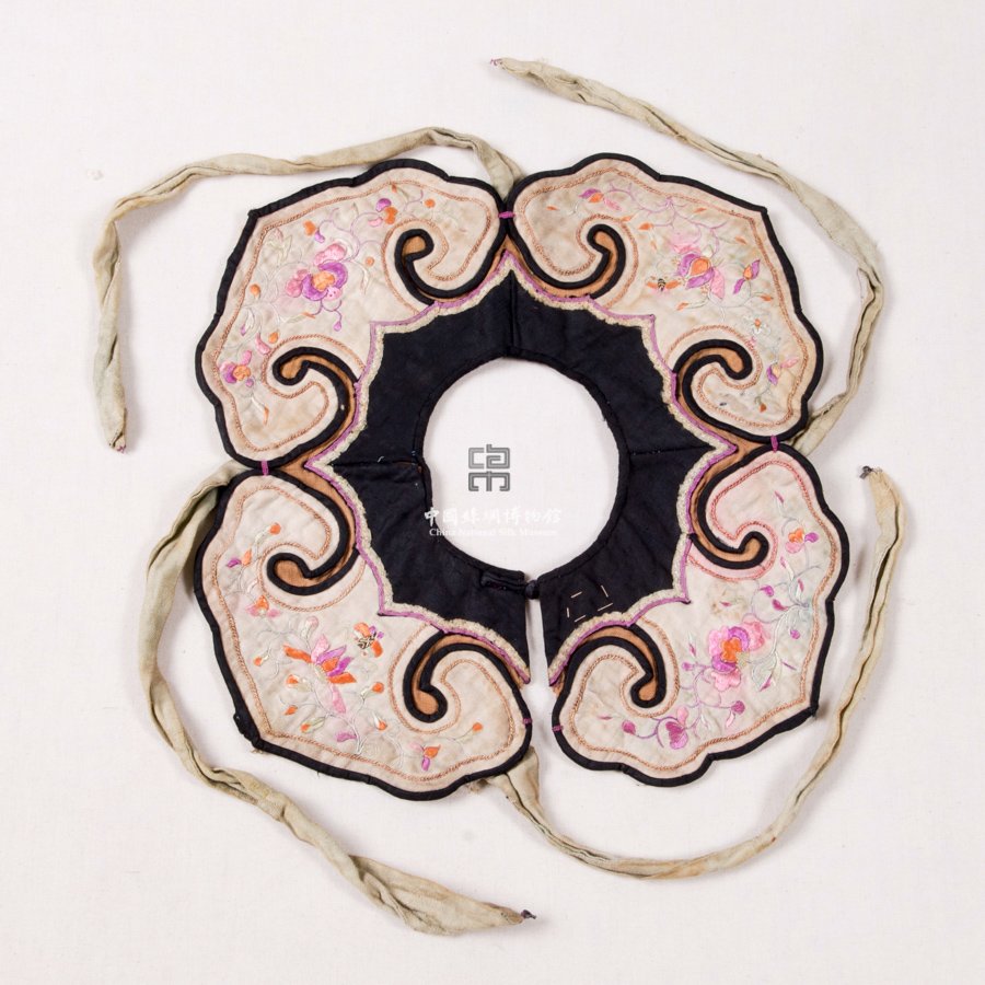 形状内容描述 该口围呈四瓣花形,在白色缎地上以彩色丝线刺绣蜂花纹样,所用针法以套针为主。周围用黑色素缎镶边。口围片周围等距离地镶有四根浅绿色丝带。