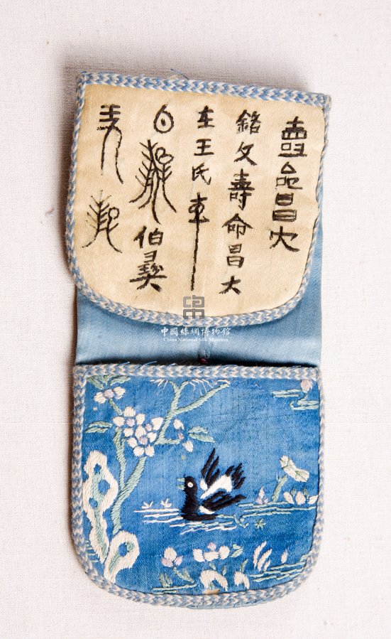 形状内容描述 该绣品为一褡裢,使用时挂在腰带之上,两端各成一个袋子,其上下袋子分别以蓝色和黄色缎为地,其上面的袋子用黑色、黄色、绿色等丝线彩绣水禽、荷花的池塘美景,其下面的袋子则绣"寿命昌大"铭文。