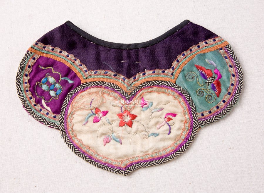 形状内容描述 该绣品为一口围片,用彩缎制成类似心形。在中间一块白色缎地上彩绣花卉纹样,左右两边紫色和绿色缎地上分别彩绣花卉蝴蝶。针法包括套针、滚针、网绣等。彩缎周围用各色小绦带镶边。