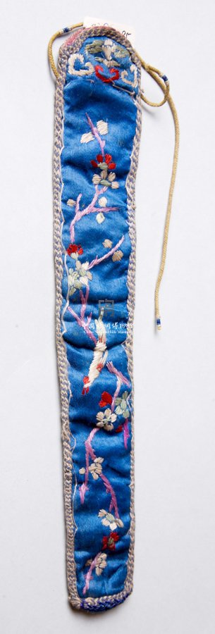 形状内容描述 该绣品为一扇套。主体面料为蓝白色素缎。其上除彩绣折枝花鸟纹样外,主要用黑色丝线绣了"南枝向暖北枝寒,一种春风有两般"诗句一段。扇套周围镶褐色小绦带花边。