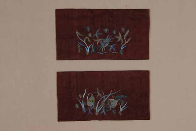 文物总分两幅,其中一幅是螃蟹游走于碧绿的水草间。另一幅是两尾小雨水中嬉戏。用高超的刺绣手法展示了一幅生动的水中世界。