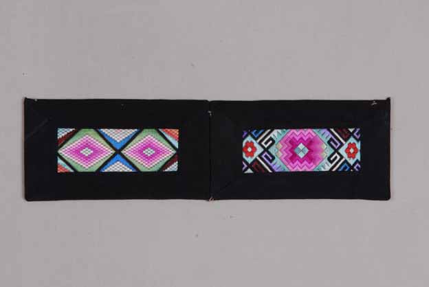 此件文物为民国几何花卉纹纳锦绣枕顶,基本以纯黑色为背景,彩色丝线缝制几何图案。不同于方形制,这两幅枕顶是长方状形制。