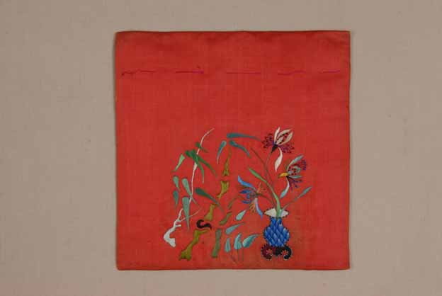 此件文物为民国大红缎地彩绣瓶花竹子纹枕顶,基本以大红色为背景,彩色丝线缝制花草类图案。整体造型清新宜人。