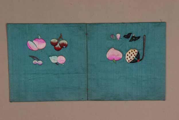 此件文物为民国湖绿缎地彩绣莲蓬枇杷纹枕顶,基本以湖绿色为背景,彩色丝线缝制果蔬类图案。整体造型清新宜人。