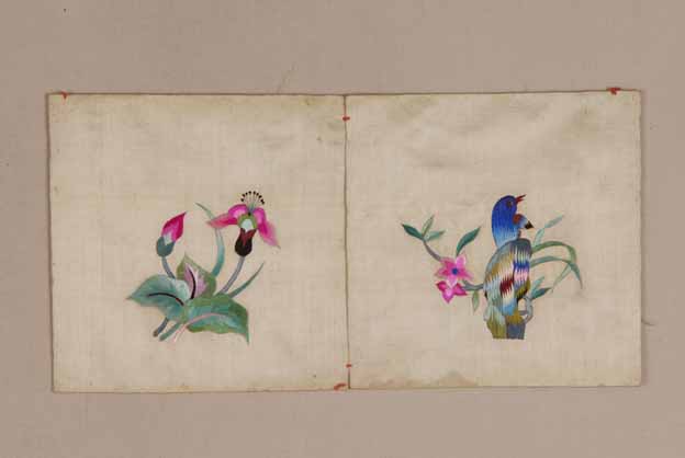 此件文物为民国白缎地彩绣花鸟纹枕顶,基本以米白色为背景,彩色丝线缝制花草鸟类图案。整体造型清新宜人。