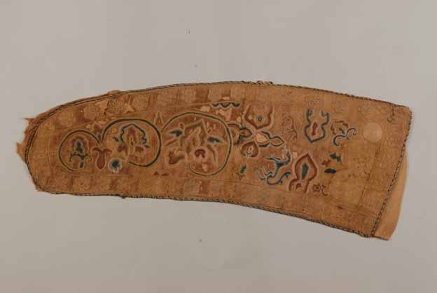 该件刺绣呈牛角形,似为一弓囊。以黄(偏棕)色菱格纹绮衬以黄色绢为绣地,用黄、蓝(绿)、褐、棕红、米白等丝线以锁绣针法刺绣花卉动物纹。沿边缘绣有一圈黄色六瓣小花,中间填以主题纹样,从上往下所见如下:一个黄色的实心圆和一个黄色的B形骨架,内无刺绣但有黑色墨迹,似有刺绣的构思但没有完成,B形骨架下伸出花卉纹;往下好像也是花卉纹,下有两只动物,似搏斗状,一大一小,一红一蓝,似狗,有三爪,颈上有三个斑点,吐长舌,尾上竖,动物下有花卉一簇;再往下是三株茂盛的花卉,枝茎卷曲,将花朵包围在其中,枝茎的顶端是盛开的花朵,花形很大,形状不明,不知为何种花卉,红色为花瓣,蓝色的或许表现的是叶片。第二株上钉了一块淡蓝色物体,残,原来是圆形,似石块或铁片,第一株偏上的位置也有,仅残有很小一部分。刺绣色彩鲜艳,图案华丽,绣线下有黑色(墨?)刺绣底稿。边缘钉缝一圈彩绳,颜色为黄(疑是绣地褪色造成)、墨绿和淡绿(近白)色,丝质。该件的背面采用的也是棕黄色菱格纹绮,有污迹,内囊为黄色绢制。