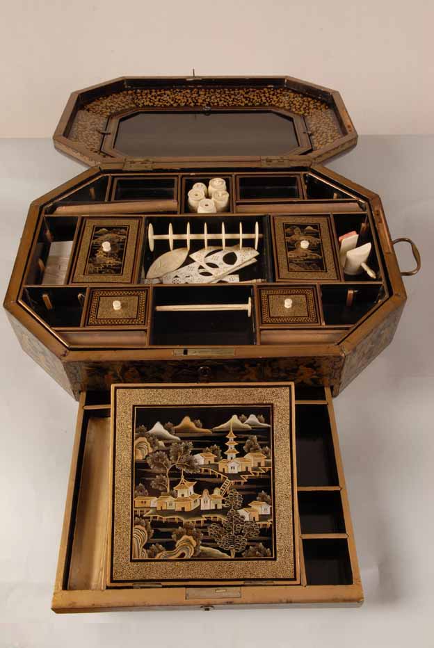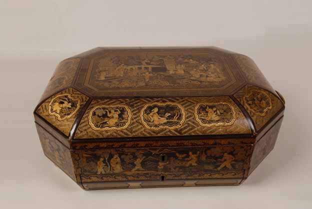 此物为清朝时期的文物。清朝时期西洋物件大量流行,此物为欧式的针线盒。针线盒上描绘了当时清代的生活场景:有弹奏琵琶的歌女,带着鸟儿遛弯的男人,还有渔夫等。此物为木质多角形。