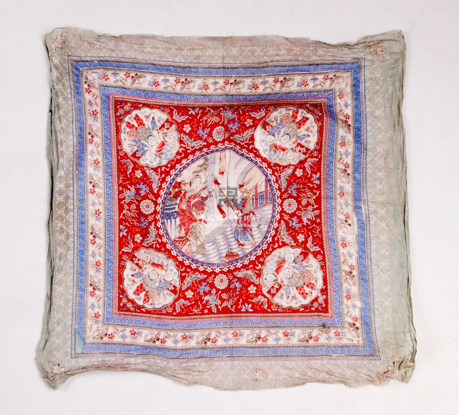 形状内容描述 该织物为一块彩色印花戏出棉手帕,方形。红色地上,印有满地花蝶纹样。四角各一个团窠形图案,中央一大团窠纹样。纹样生动,色彩艳丽。
