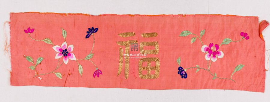 形状内容描述 该织物为一块长方形红色缎平金绣"福"字花卉桌围横披。平金绣是用金线平铺在绣面上,将丝线用短针钉住,钉线距离一分到一分半(约3mm),按所绣形状盘旋填满,一般两根金线为一组钉一针,组与组之间钉线针迹相错。