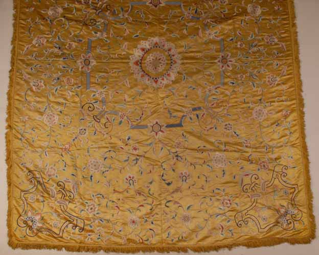 清外销黄缎地彩绣缠枝莲花纹床单